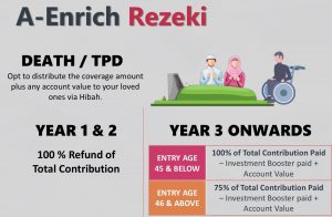 Enrich Rezeki is for those who are looking to build their retirement or children’s education fund. The minimum amount of contribution per month is RM 500, equivalent to RM 6,000 per year and up to RM 50,000 per year.
