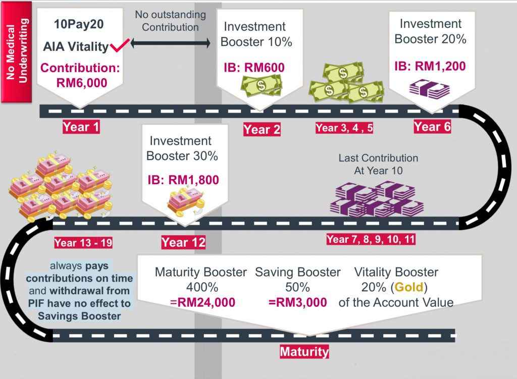 When the plan matures on its 20th year, Enrich Rezeki will reward you with a Maturity Booster, 400% times your annual contribution (400% x RM 6,000 = RM 24,000) with an additional Savings Booster, 50% times your annual contribution (50% x RM 6,000 = RM 3,000). And if you are a member of AIA Vitality, by achieving at least Gold Status, you will get an additional 20% boost out of your existing account value.